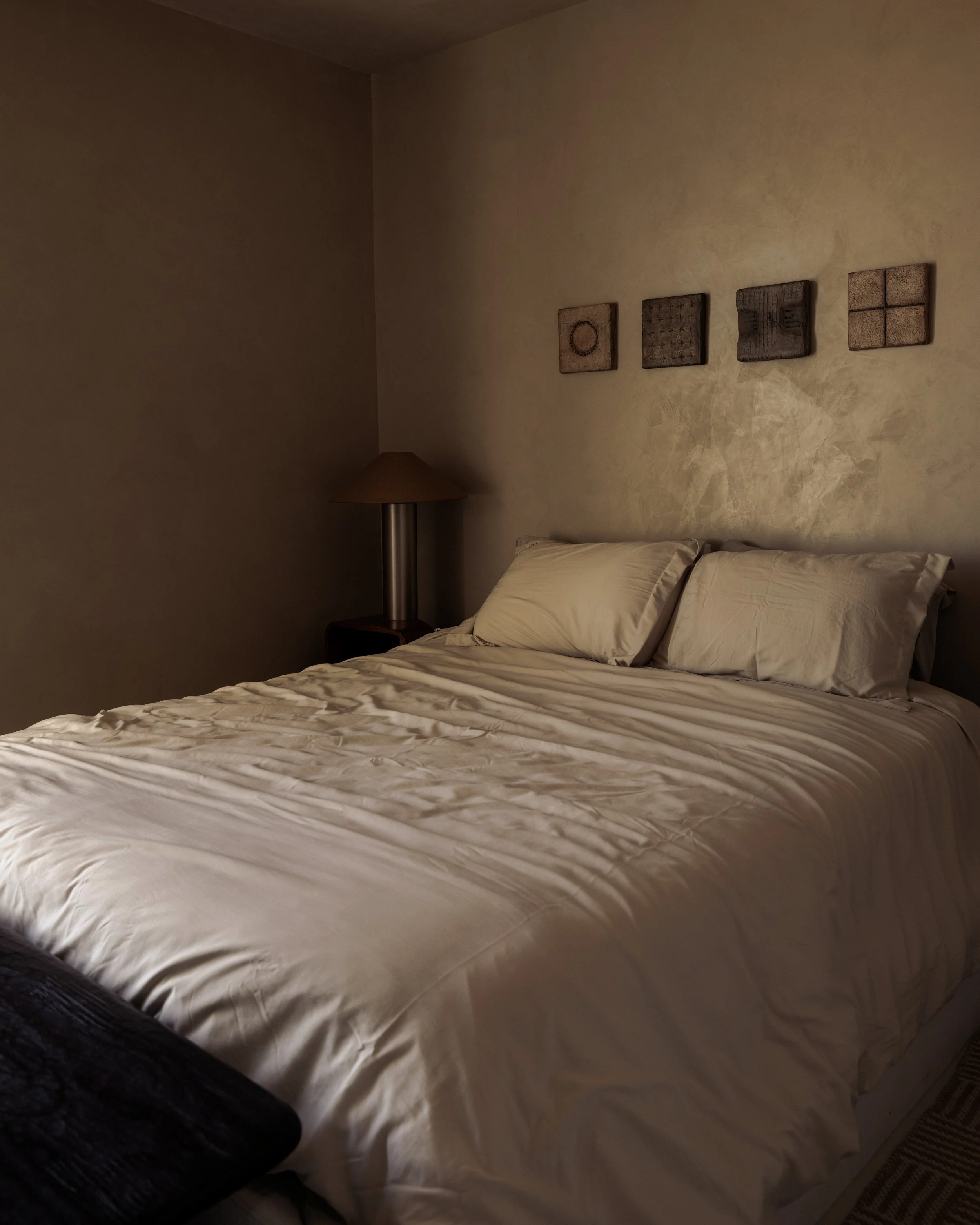 The Desert Nest is a cozy, design-forward haven with organic, sculpted textured walls and wabi-sabi textured artwork, thoughtfully appointed with a full-size RH designer dresser and clothing rack for an easy unpack-and-settle stay. A quiet pocket of the property sits just outside your door, framed by rows of sage that lend a subtle European feeling and a naturally soothing aroma, all against views of the open desert, boulders, and ancient olive trees. Step outside with your coffee, breathe in the stillness, and watch the desert light shift as the sun rises. Inside, the space moves with the day, softly sunlit at dawn, or transformed into a serene, cave-like retreat with blackout curtains when you want deeper rest.
