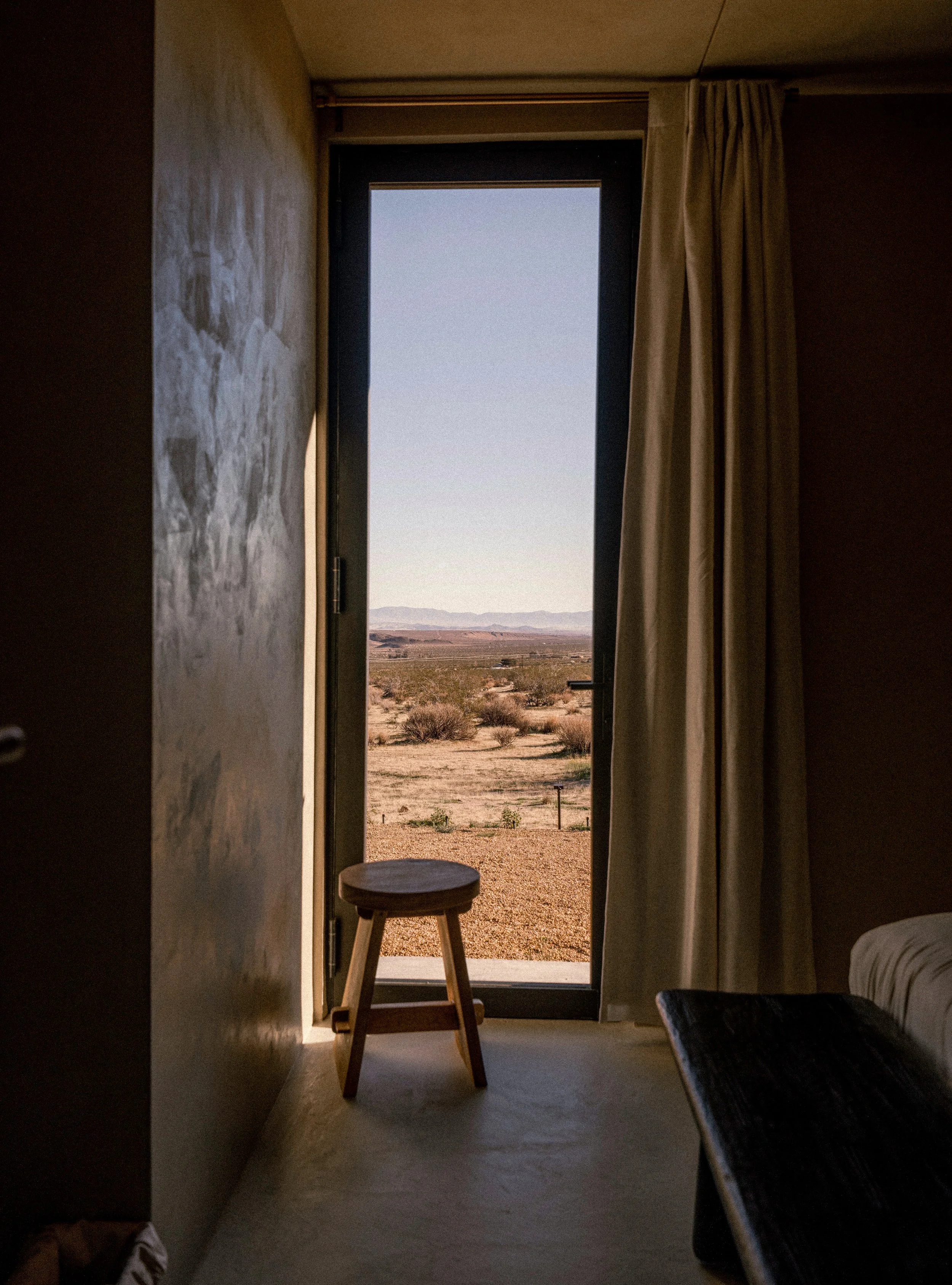 Designed as its own private haven within Hikari House, the Horizon Room, just off the front patio, offers seclusion and serenity, giving you space to retreat, restore, and move at the desert’s pace. Fall asleep beneath the desert sky, then wake up to panoramic views of Joshua Tree’s timeless, Martian-esque boulder landscape, recharging in your own quiet sanctuary. Wrapped in expansive floor-to-ceiling glass, it offers a nature-forward stay with modern comforts, featuring light-blocking shades for deep rest and a dedicated mini-split AC and heating unit for effortless temperature control.
